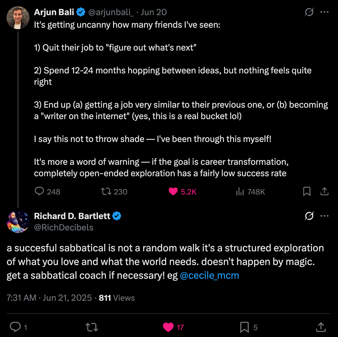 While I disagree with the premise that returning to a job similar to your old one = failure, I wholeheartedly agree with the real message which was called out in the replies: if you treat your sabbatical like a random walk in the park then you’re leaving too much of the outcome to luck.